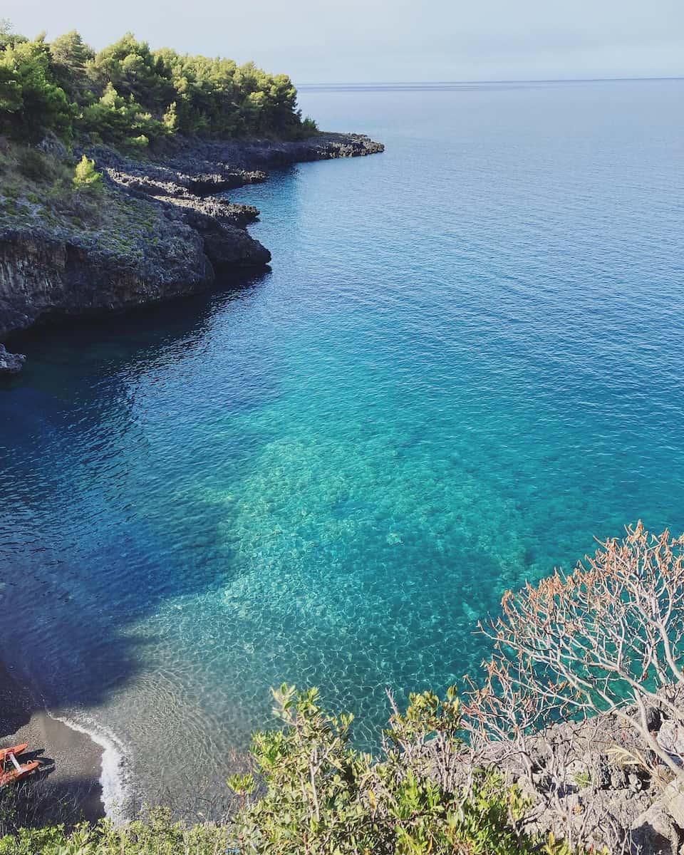 Basilicata’s most distinctive beach is a crescent of volcanic black sand, embraced by sheer cliffs and turquoise water beneath beech-scented pines in the valley below the headland. I scrambled down the sentiero at dawn and had the cove to myself, the sand still cool underfoot as waves excavate small shelves along the tideline. Access is via a steep trail from Via dei Gabbiani — sturdy shoes are a must for the final section beneath the castello-like lookout on the ridge.