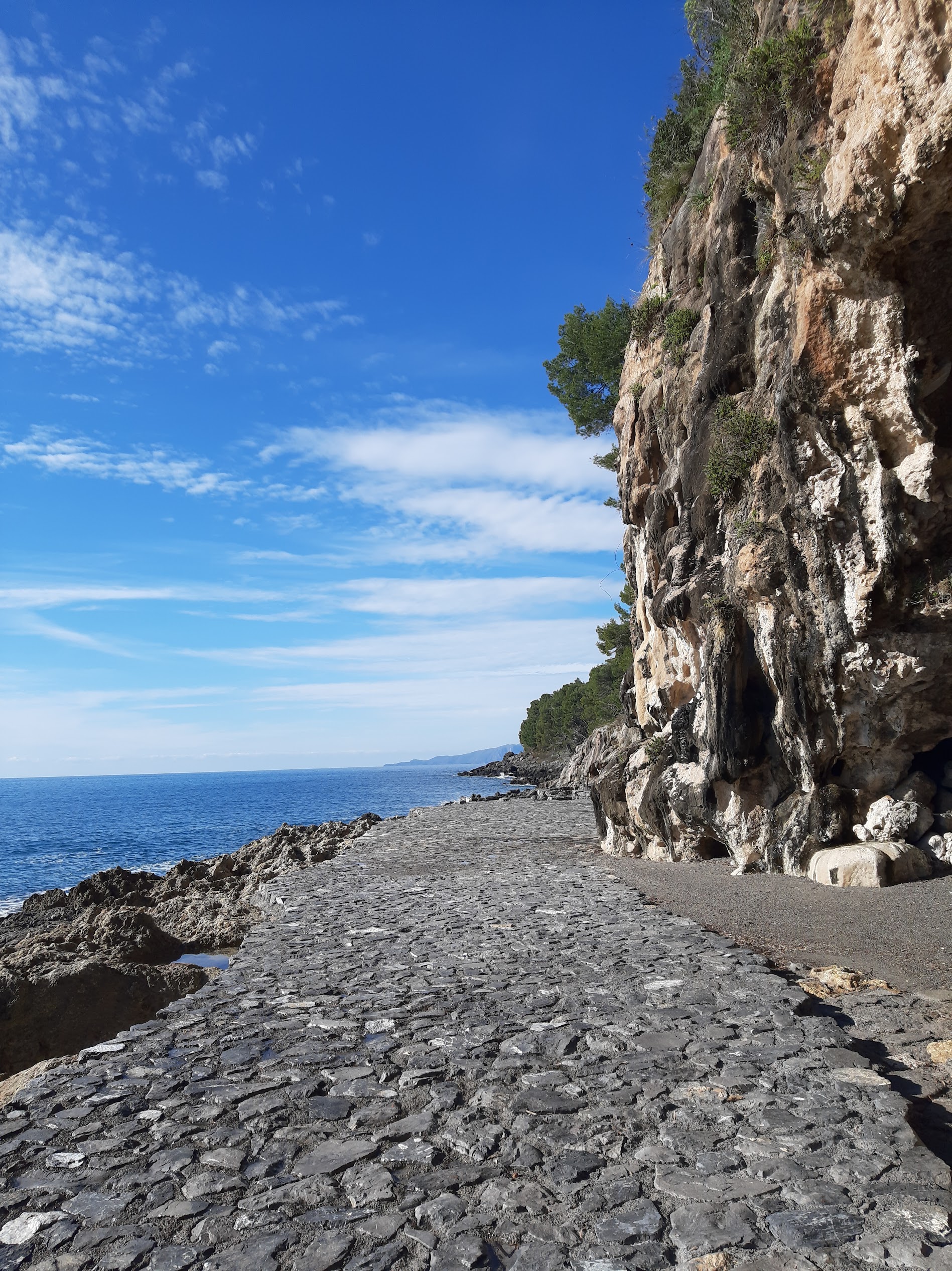 Reach the beach via a steep track off the SS18 coastal road — park where you can and descend carefully past the stone wall below the monastery path. Locals know to bring a picnic and claim the flat boulders for sunset, when light washes the old abbey façade gold. For the adventurous, the coastal path leads to hidden inlets and sea caves, and Macarro is best in late afternoon, when the sun warms the sand and the crowds have gone and the abbey ridge glows above the bay.