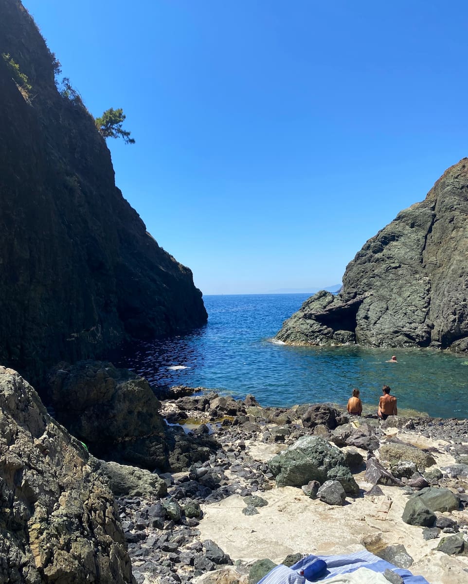 Reach the cove via a narrow path from Anzo village—locals love it for early morning swims away from crowds along many paths carved into the slope. There’s no bar or facilities, just rocks and the sound of the sea below Serro’s ridge. The viewpoint above the cove is perfect for sunset photos, and the Genoese watchtower on the hill is a reminder of the area’s maritime past with amazing views in every direction.