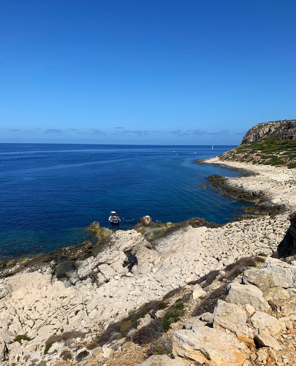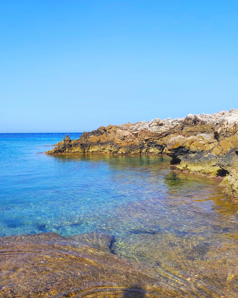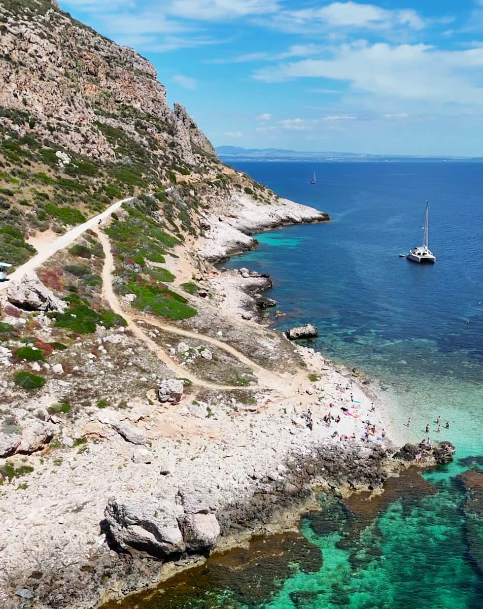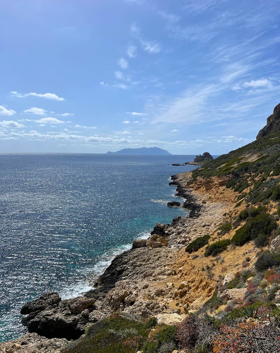 Hike the northern trail from the village, passing wild thyme and oregano, and keep an eye out for seabirds soaring above as the path shifts from dirt to short paved road sections near lookout points. Locals recommend the hidden viewpoint behind the large boulder — a quiet perch for sunset that feels worlds away from the bustle near Cala Rossa. The walk is about 40 minutes from town; mornings and late afternoons are best for avoiding the midday heat, and the final 10-minute walk to the water is rocky but rewarding.