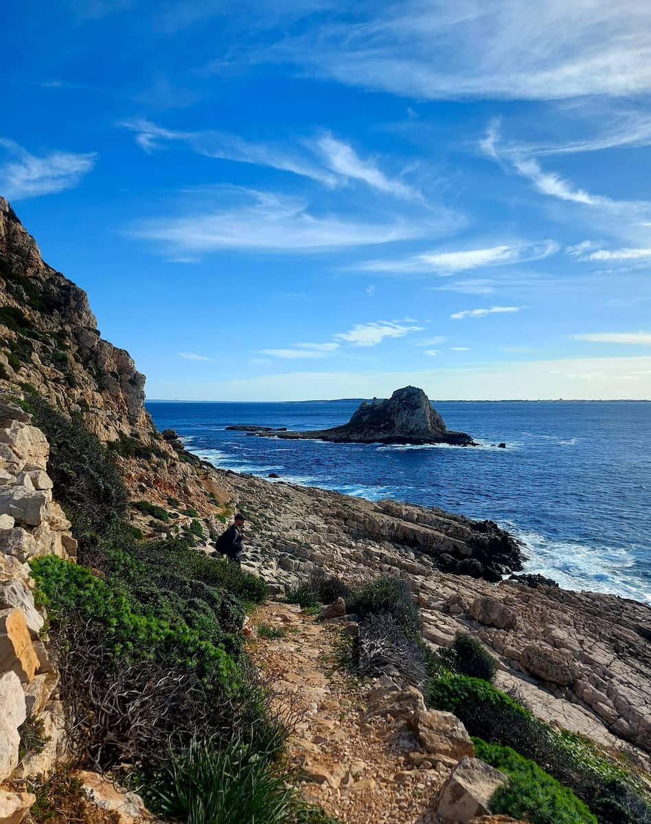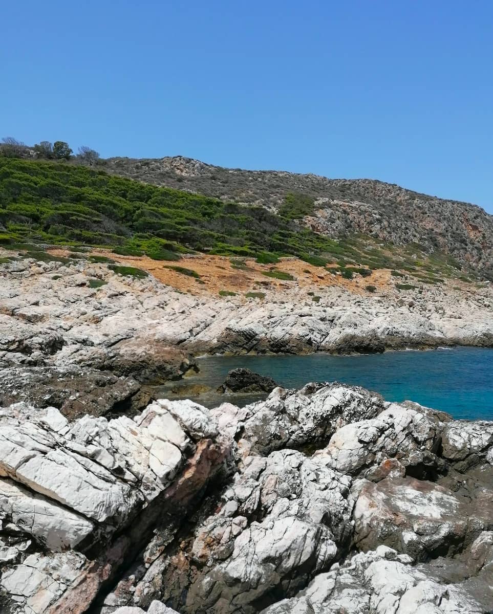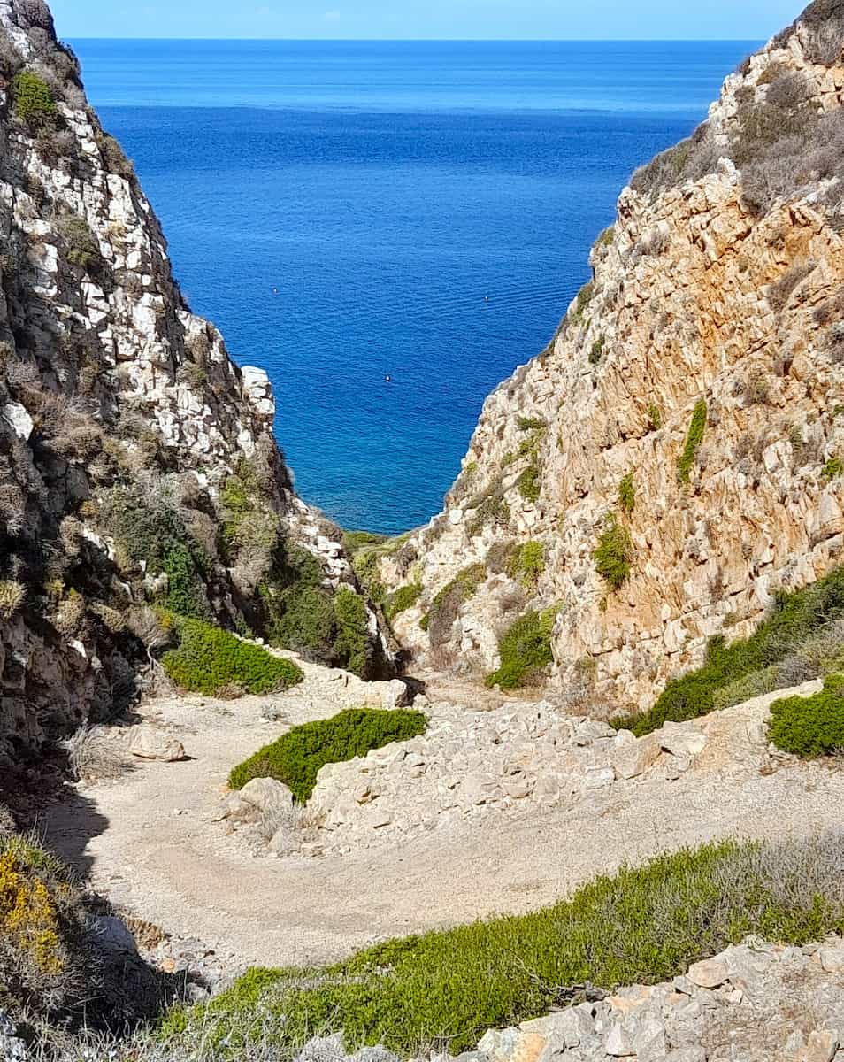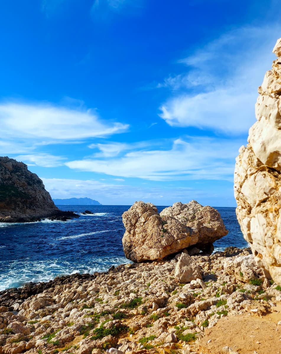 Hike the northern trail from the village, passing wild thyme and oregano, and keep an eye out for seabirds soaring above as the path shifts from dirt to short paved road sections near lookout points. Locals recommend the hidden viewpoint behind the large boulder — a quiet perch for sunset that feels worlds away from the bustle near Cala Rossa. The walk is about 40 minutes from town; mornings and late afternoons are best for avoiding the midday heat, and the final 10-minute walk to the water is rocky but rewarding.