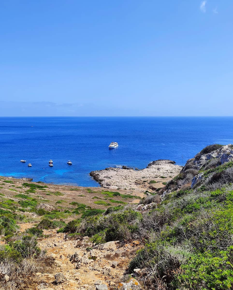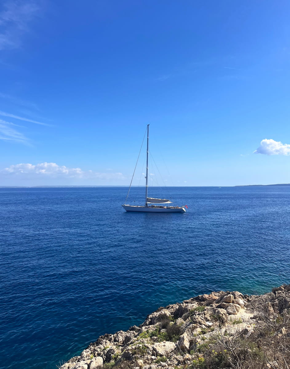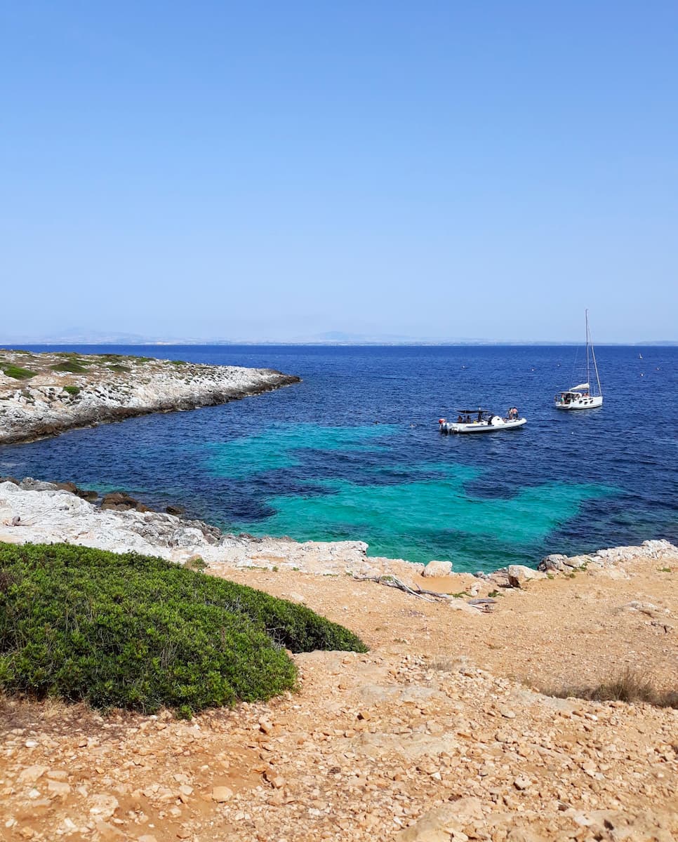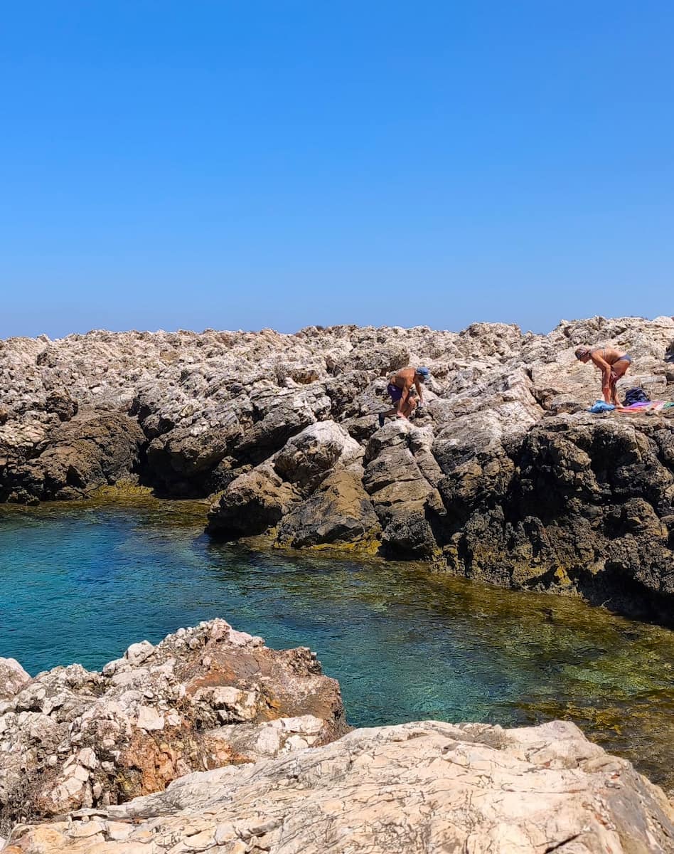 Hike the northern trail from the village, passing wild thyme and oregano, and keep an eye out for seabirds soaring above as the path shifts from dirt to short paved road sections near lookout points. Locals recommend the hidden viewpoint behind the large boulder — a quiet perch for sunset that feels worlds away from the bustle near Cala Rossa. The walk is about 40 minutes from town; mornings and late afternoons are best for avoiding the midday heat, and the final 10-minute walk to the water is rocky but rewarding.