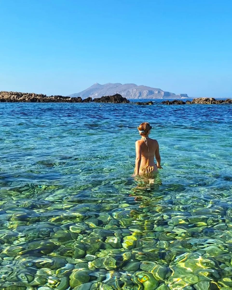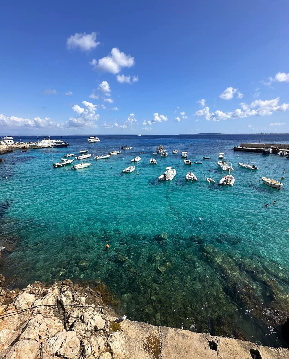 Cala Faraglione is famous for its photogenic sea stack and vibrant blue waters, one of the classic attractions of Levanzo with views toward Favignana Island. I climbed the low rocks at the edge of the beach, mesmerized by the play of light on the seabed below at this small pebble beach. This small pebble cove (about 50 meters) is ideal for swimming and snorkeling in calm summer seas and is easy to reach compared with more remote spots around Favignana and Levanzo.