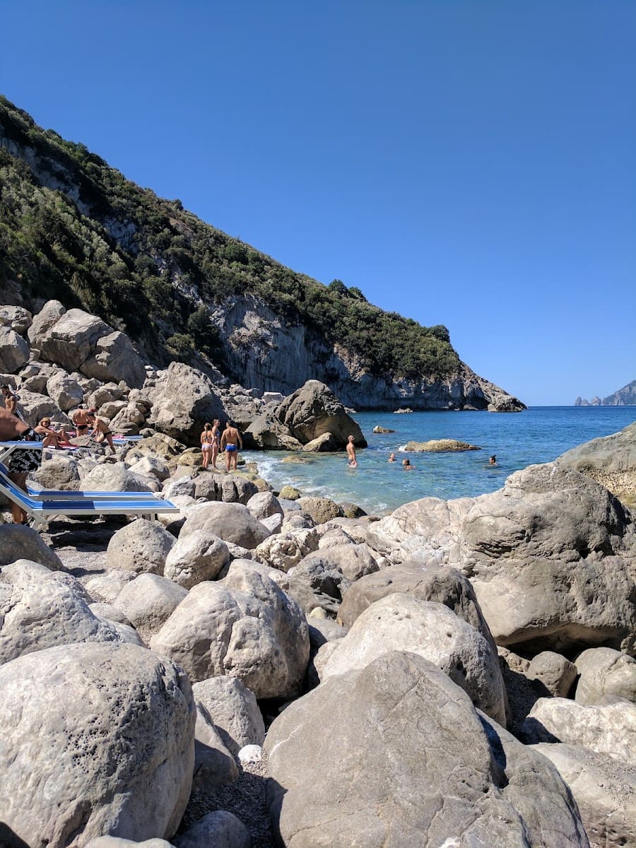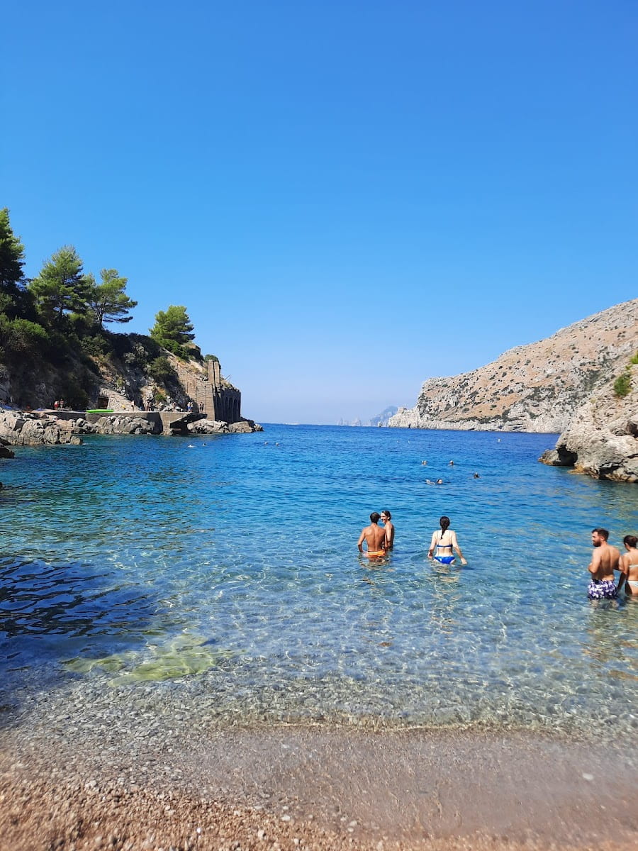 A symphony of cicadas and the scent of sun-warmed rock mark the steep descent into Crapolla Cove—700 ancient steps winding past abandoned monasteries, chapels, and a landscape in Campania that feels almost mythological, with views toward Positano on clear days. The beach is tiny, pebbly, and shaded by towering cliffs—perfect for a restorative dip after the hike. The water is deep, clear, and cold, ideal for confident swimmers and those chasing quiet before continuing along the coast toward Pompeii or a ferry crossing to Capri. Best visited in late spring or early autumn for cooler climbs and time to toast the descent with local limoncello.
