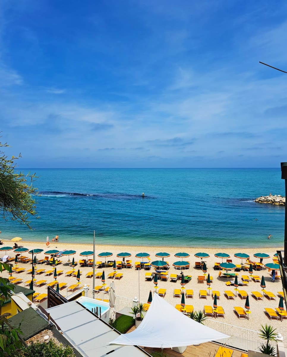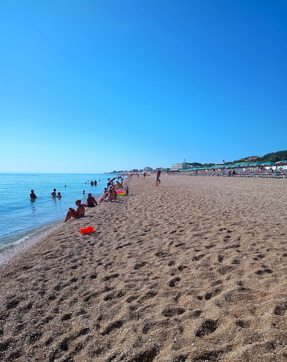 Perched above the sea, Scossicci Beach offers wide views of the Adriatic and Monte Conero’s cliffs. The sound of kids laughing and the distant hum of boats create a relaxed, holiday vibe. The beach is gravel and sand, about 700 meters, with calm waters in summer.