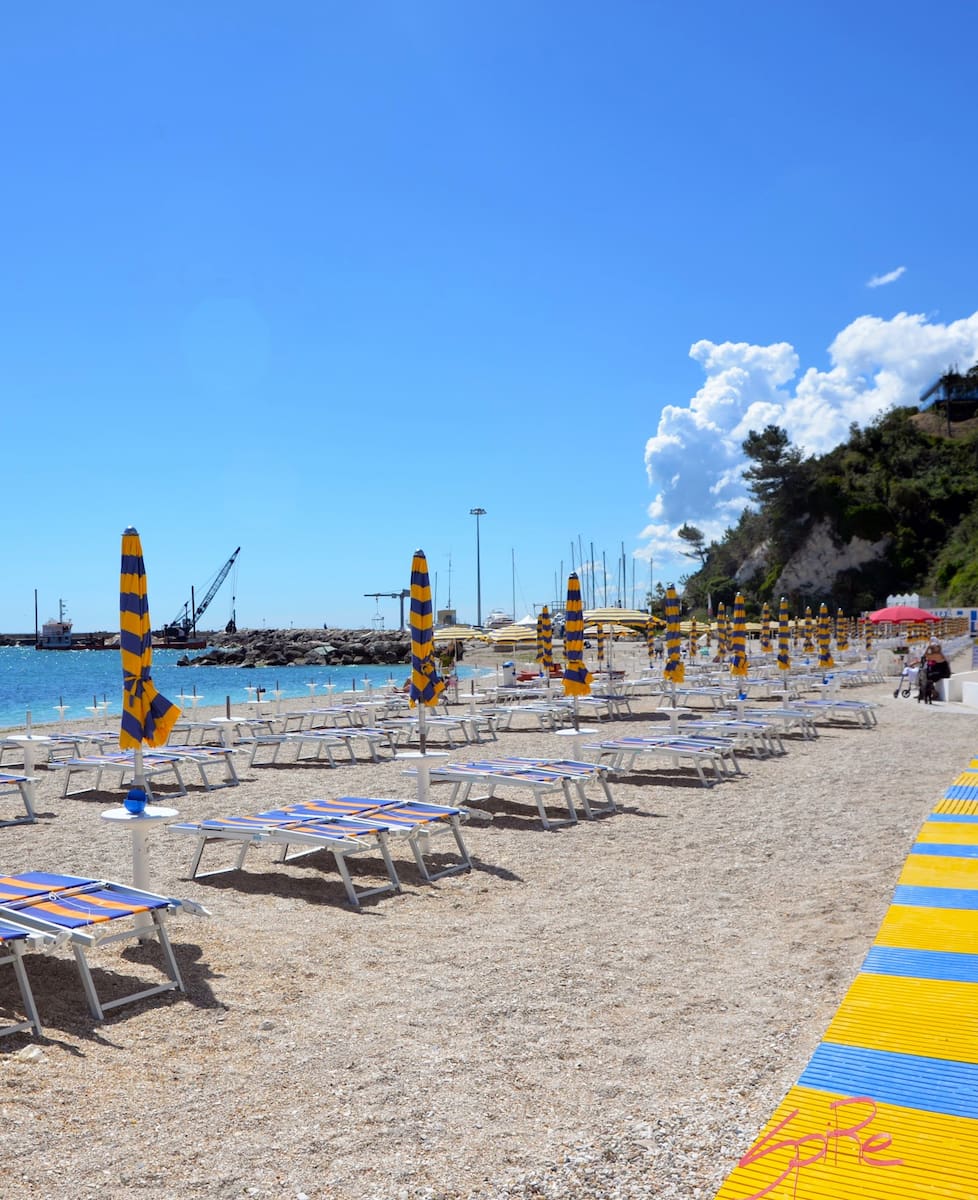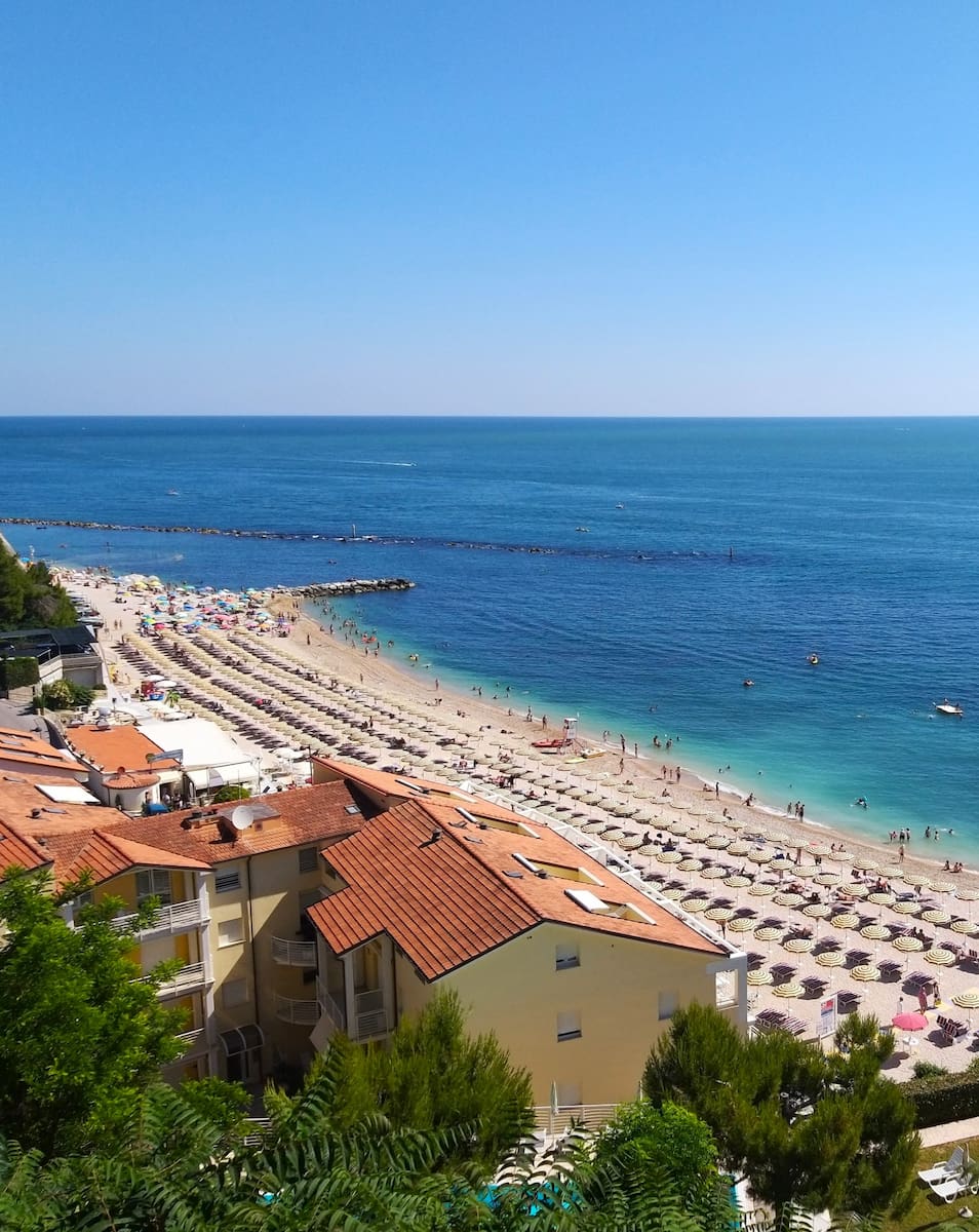 Numana Bassa Beach stretches along the lively waterfront, with umbrella rows, beach bars, and a promenade perfect for evening strolls, while just up the coast Mezzavalle Beach is situated beneath cliffs for a wilder feel. The mix of sand and gravel is gentle underfoot, and the water stays warm into early autumn as the beach extends south toward Marcelli.