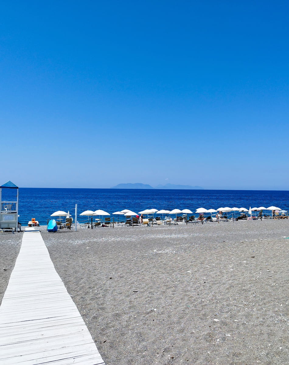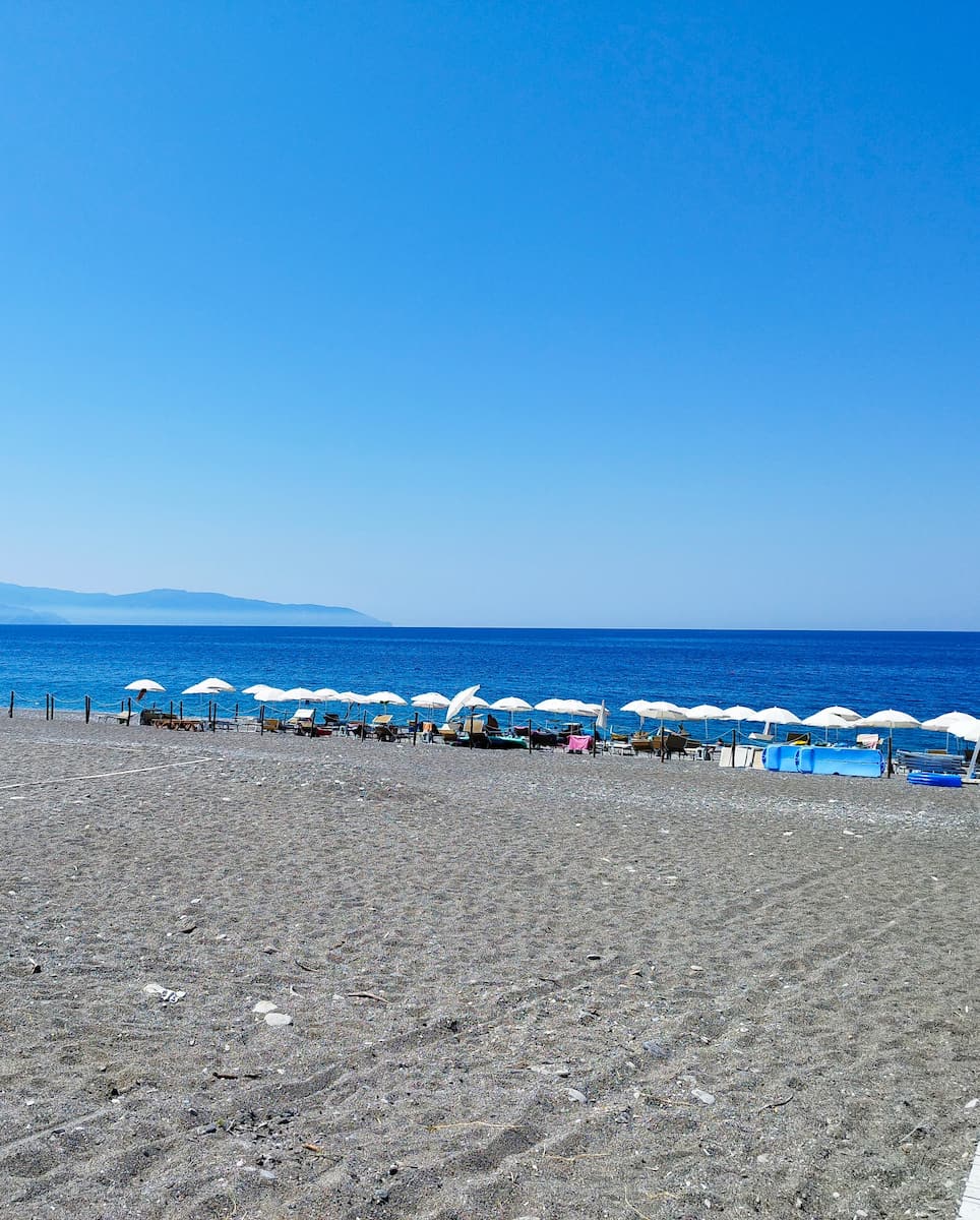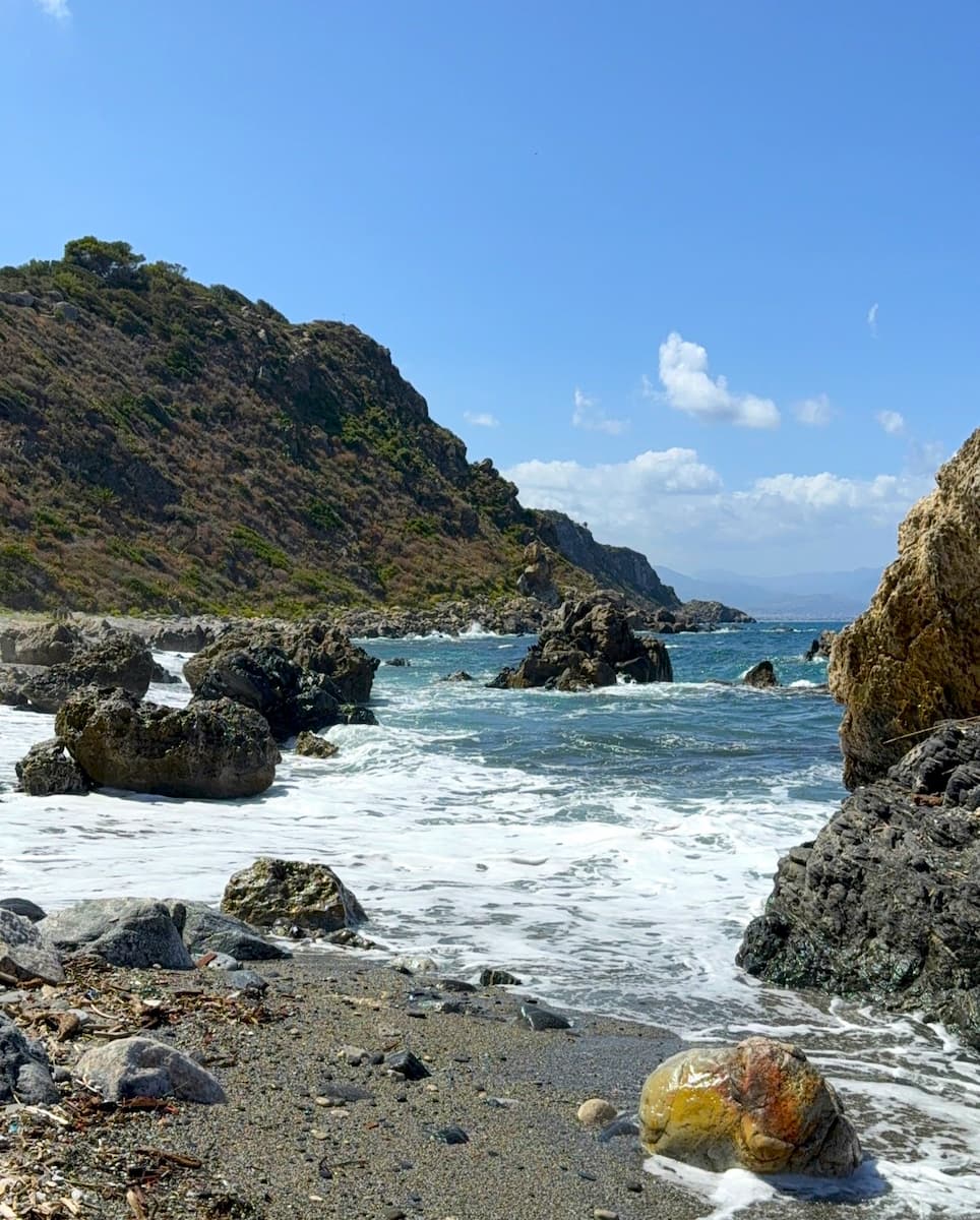Walking down to this pebbly beach on the peninsula, you hear waves hitting the volcanic cliffs—a wilder, more elemental sound than the gentle lapping on the main bay shaped by ancient vulcano forces. I scrambled over smooth rocks to reach tiny, hidden coves, then climbed to the lighthouse for a picnic above the clear blue with a beautiful view. This 1.2 km beach has the best swimming and snorkeling June to September, a quiet gateway to raw coastal nature.