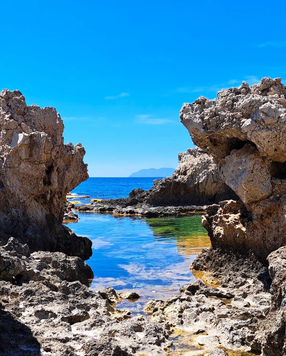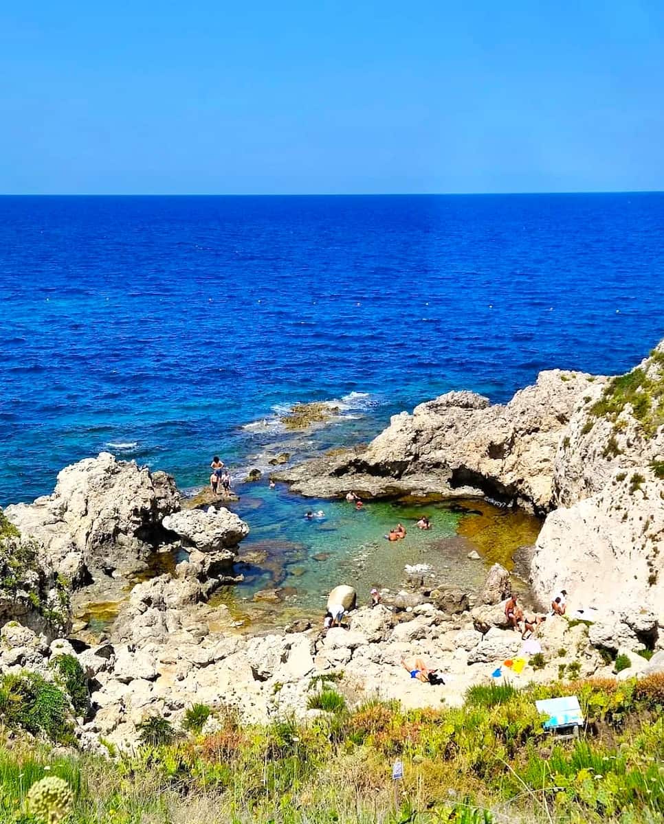 The Venus Pool is a local legend, tucked beneath the Capo di Milazzo cliffs—it’s cooler, wilder, and often quieter than the main beaches that sit near the port. Sunbathing right above the main pool, you get gorgeous views of the Aeolian Islands while enjoying a naturally formed spiaggia libera feel without services. Hike there early for privacy; there’s no shade or facilities, so bring water and a hat and treat it as a pristine free beach experience.