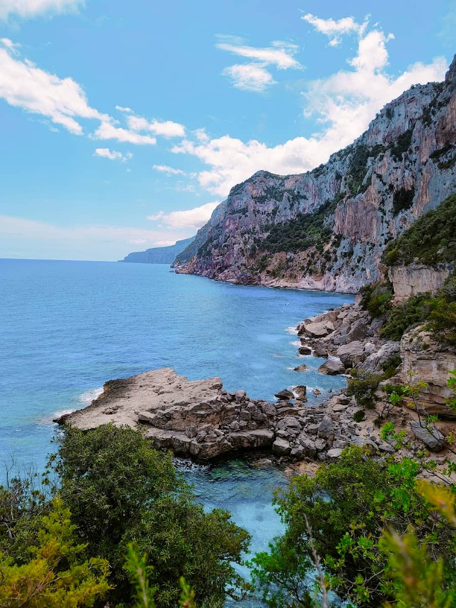 Cala Goloritzè is reached from the Golgo plateau parking lot in Baunei via a steep, well-marked trail (1–1.5 hours each way) that drops through macchia before the last 1 km of switchbacks. Locals often start early to avoid crowds and midday heat, and pack a light lunch to enjoy above the cove where the water glows an intense blue below Sa Perda’s limestone walls. On the way back, don’t miss a dip at the natural pool near the trailhead, especially favored by early risers heading onward toward Perda Longa or the coastal paths that link to other unspoilt cliff coves.