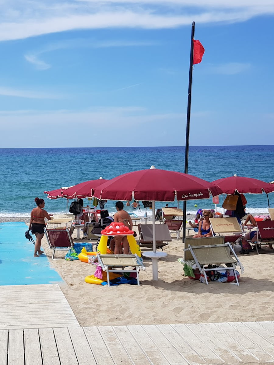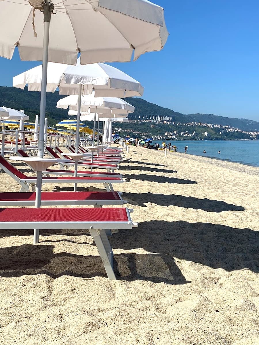 A short drive north of Pizzo centro via the A2 motorway, Spiaggia Marinella is a classic Italian beach club scene—white umbrellas, sunbeds, and a lively summer crowd drawn to the coastal town’s emphasis on fresh seafood and vibrant beach life. The sand here is soft and pale, the sea calm and shallow, perfect for families with young children and anyone wanting to stay in Pizzo near the beach with all amenities. The beach stretches about half a kilometer, with several lidos (beach clubs) side by side, each offering snacks, drinks, and attentive service from June through September, when the atmosphere is warm with clear skies.