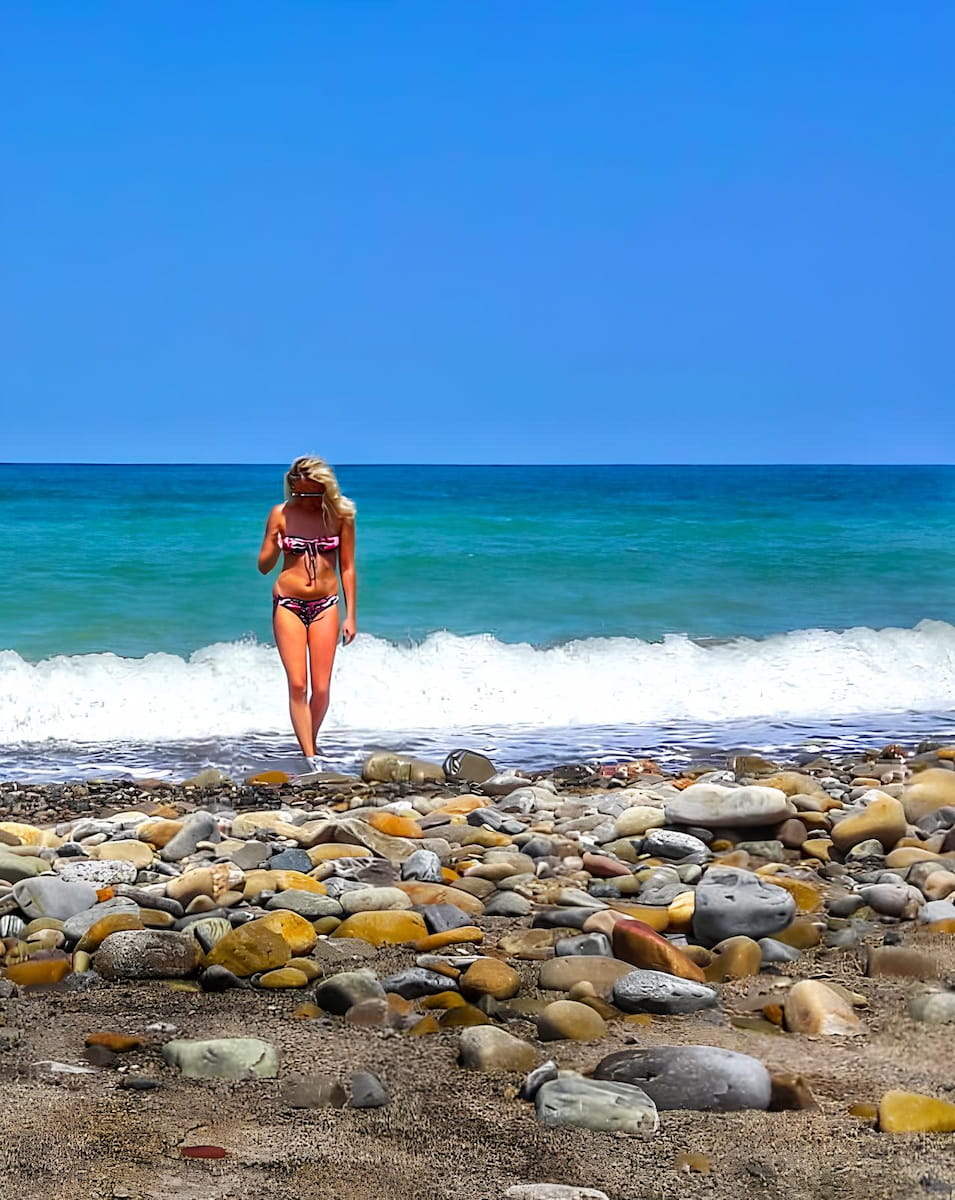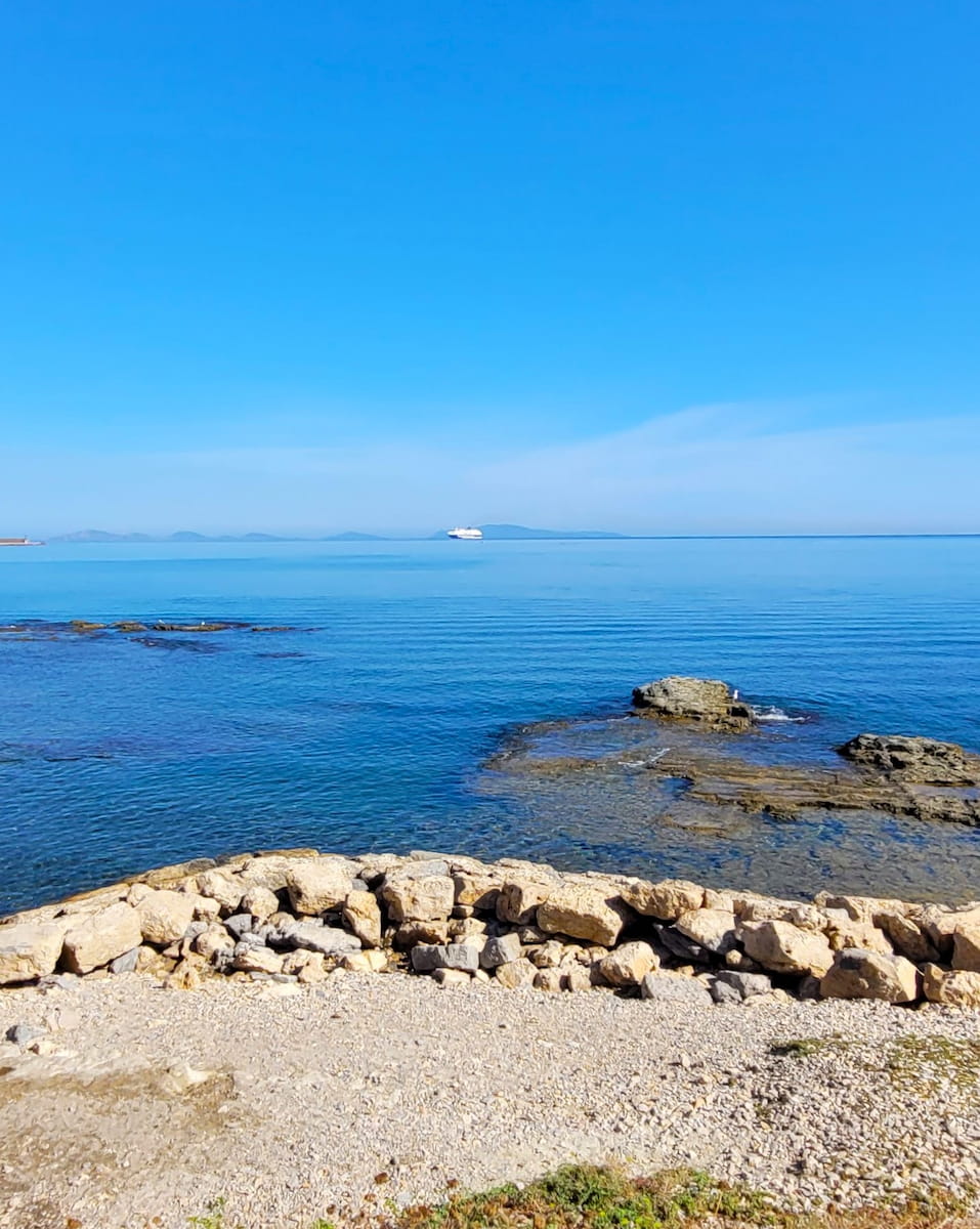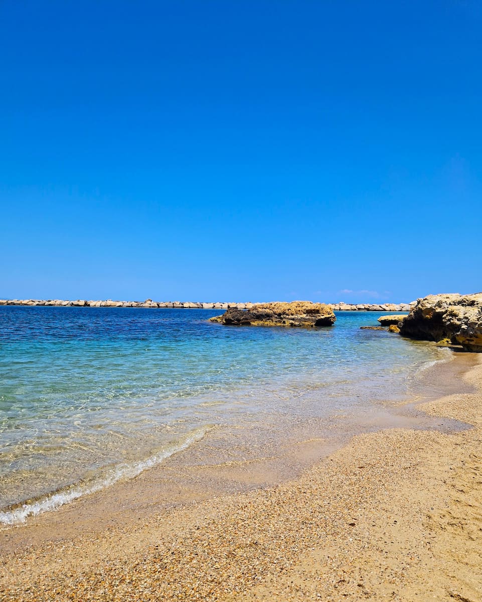 Soft, gold sand feels warm under your feet as you step into Balai Beach’s clear, shallow waters—protected from strong winds by a natural rock cove. I often grab a takeaway coffee from a nearby bar and wander the palm-lined promenade before settling onto the sand for a morning swim. This is a small, urban beach (about 250m long) with fine sand, calm waves, and gentle slopes, best visited from May to September for warm, smooth seas and plenty of sun.