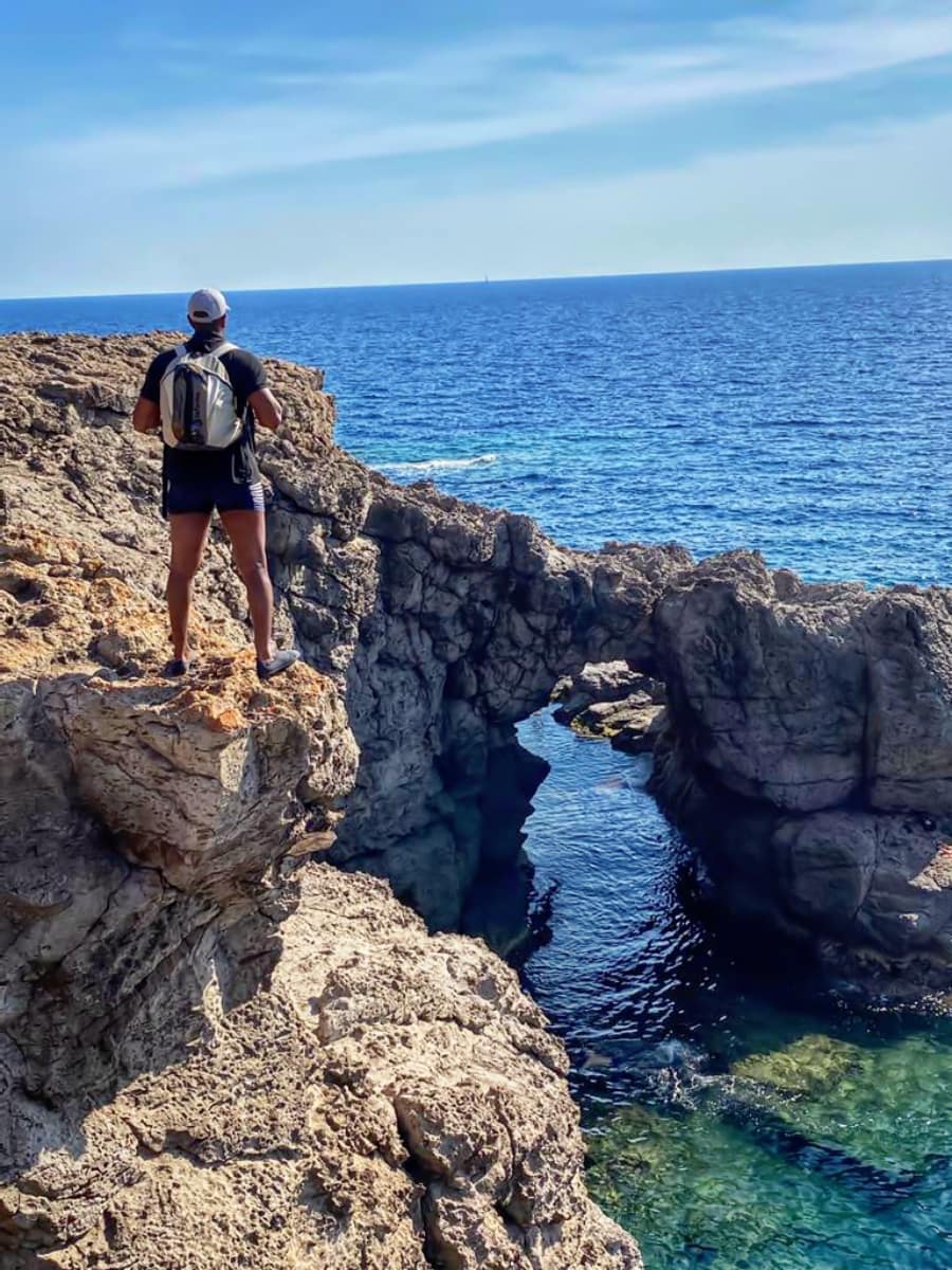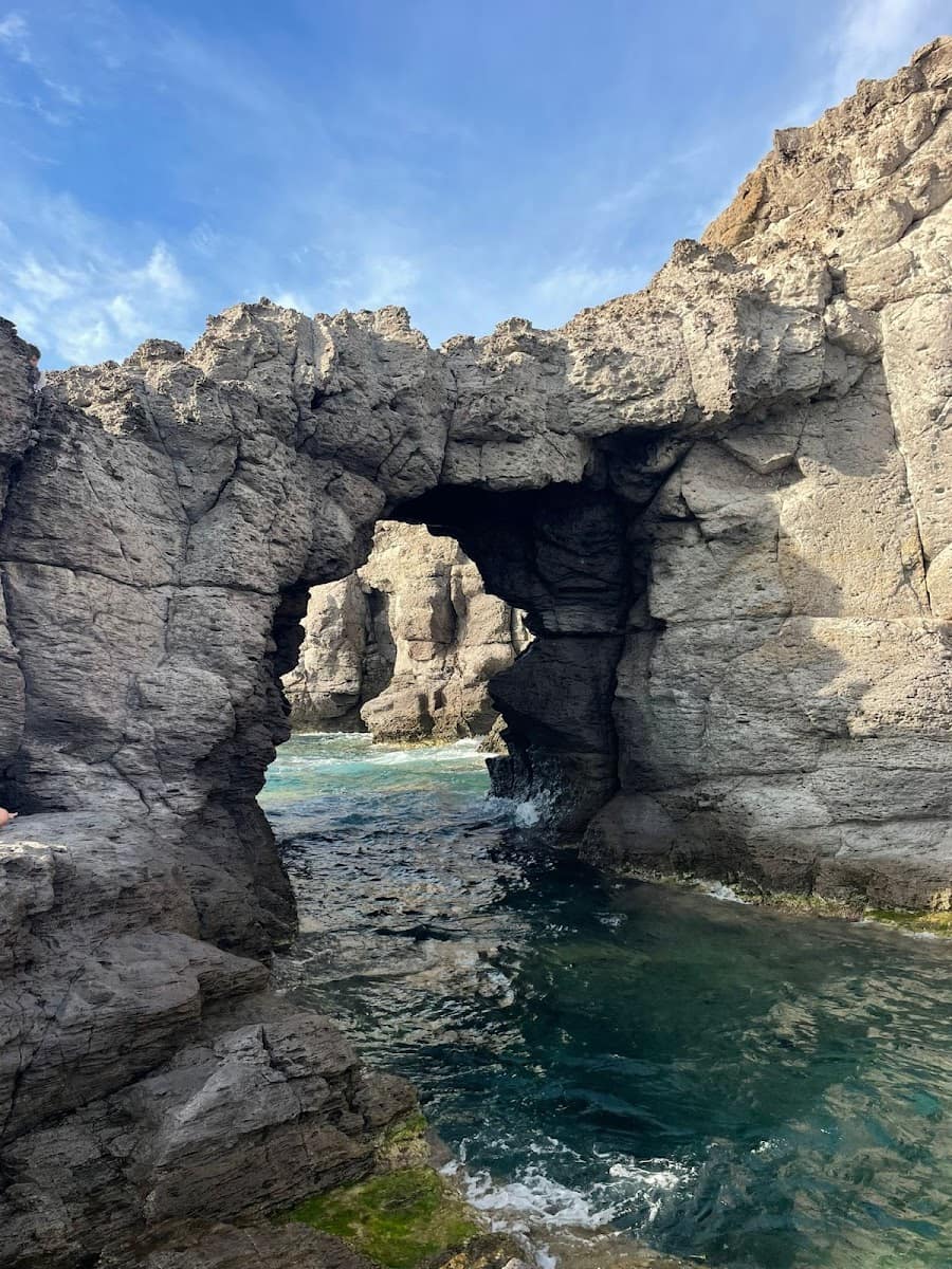 Park at Cala Sapone and hike 15 minutes west along the cliff path to reach Arco dei Baci, passing viewpoints that line the coast along the coast. There are no facilities here, but the flat rocks are perfect for picnics, and locals love the hidden platform just past the arch for sunset watching near the old necropolis trail. The nearest landmark is the abandoned tuna fishery at Cala Sapone—worth a quick look for history buffs before heading back toward the basilica and the ethnographic museum in Sant’Antioco city. Come in the late afternoon for dramatic light and cooler temperatures at this ideal place for unspoiled scenery.