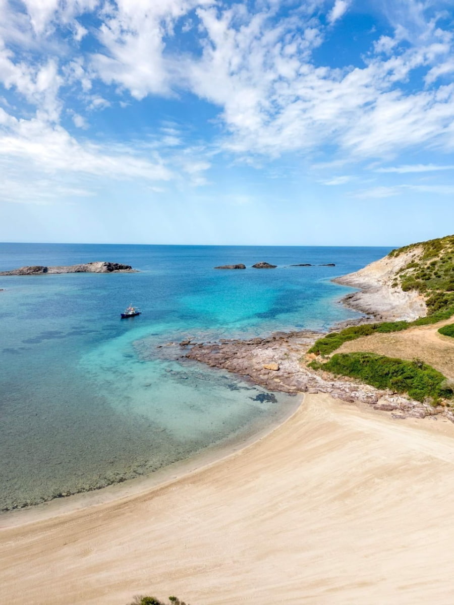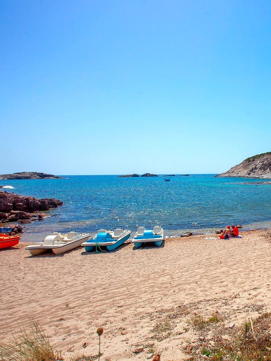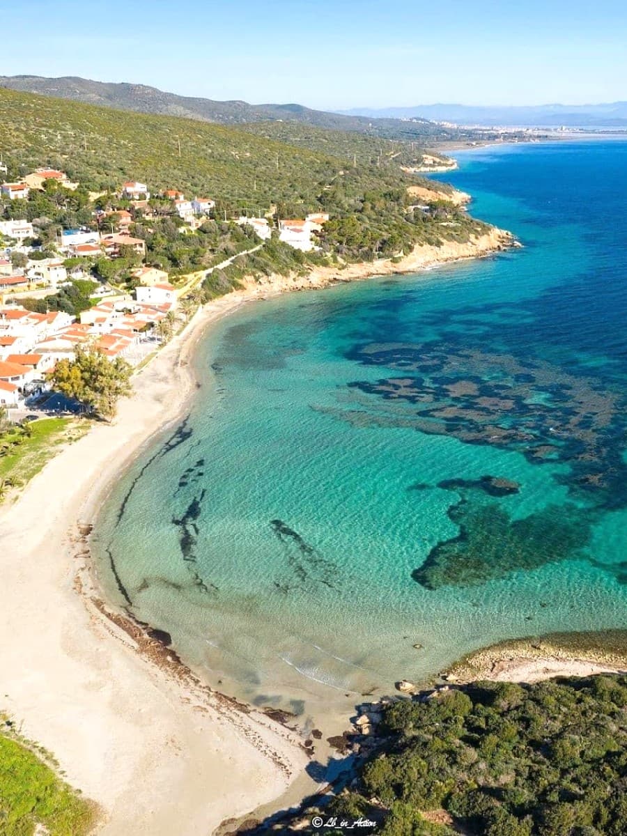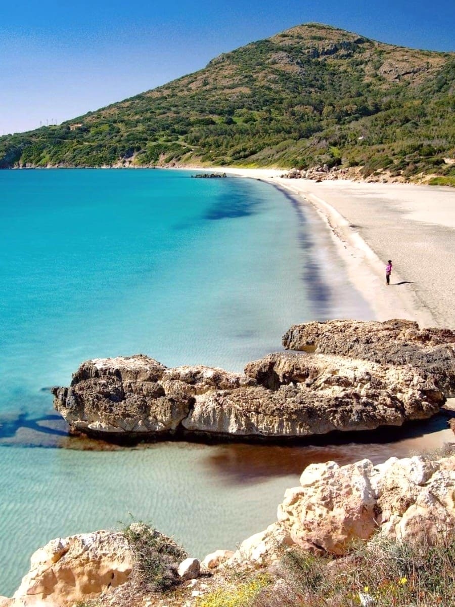 The sand here is thick and white, with volcanic streaks giving it a unique texture, and pockets of white sand appear along the shoreline. Waves are gentle, and the seabed stays shallow far out even when the mistral wind ruffles the surface. I followed the coastal path from Maladroxia, discovering hidden rock pools where locals collect sea urchins near an old archaeological site on the cliffs. At 1.5 km long, Coaquaddus is Sant’Antioco’s best beach for long walks, nature lovers, and anyone who wants to feel the island’s wild side on an island by a bridge formed by an artificial isthmus. Spring and autumn bring fewer crowds and sparkling water.