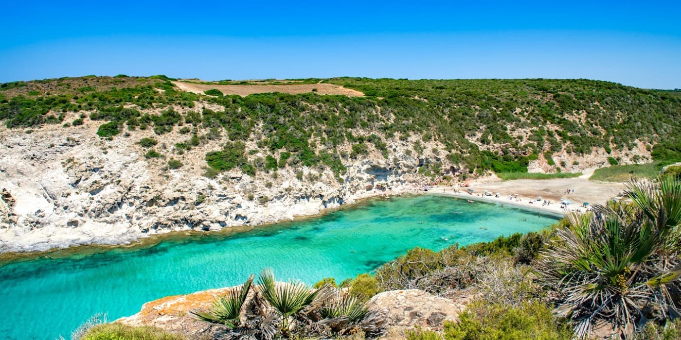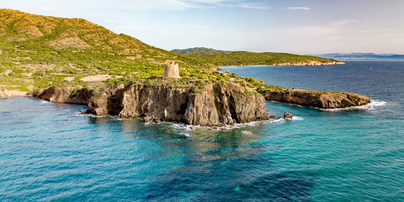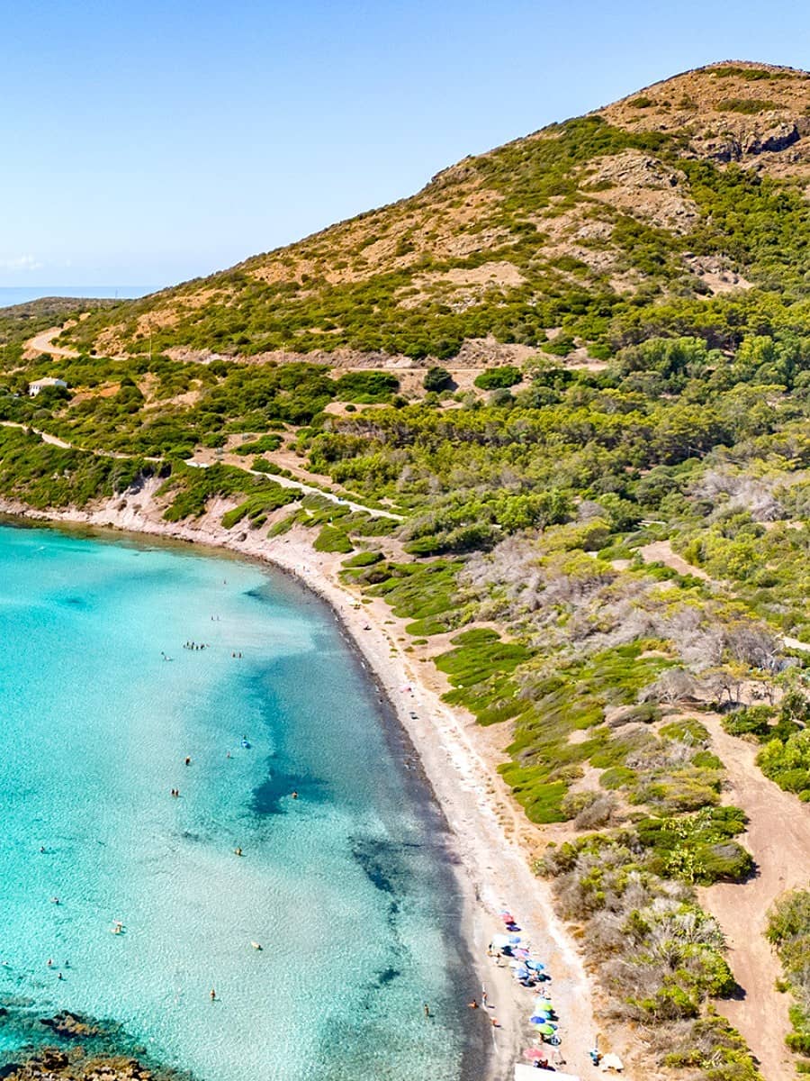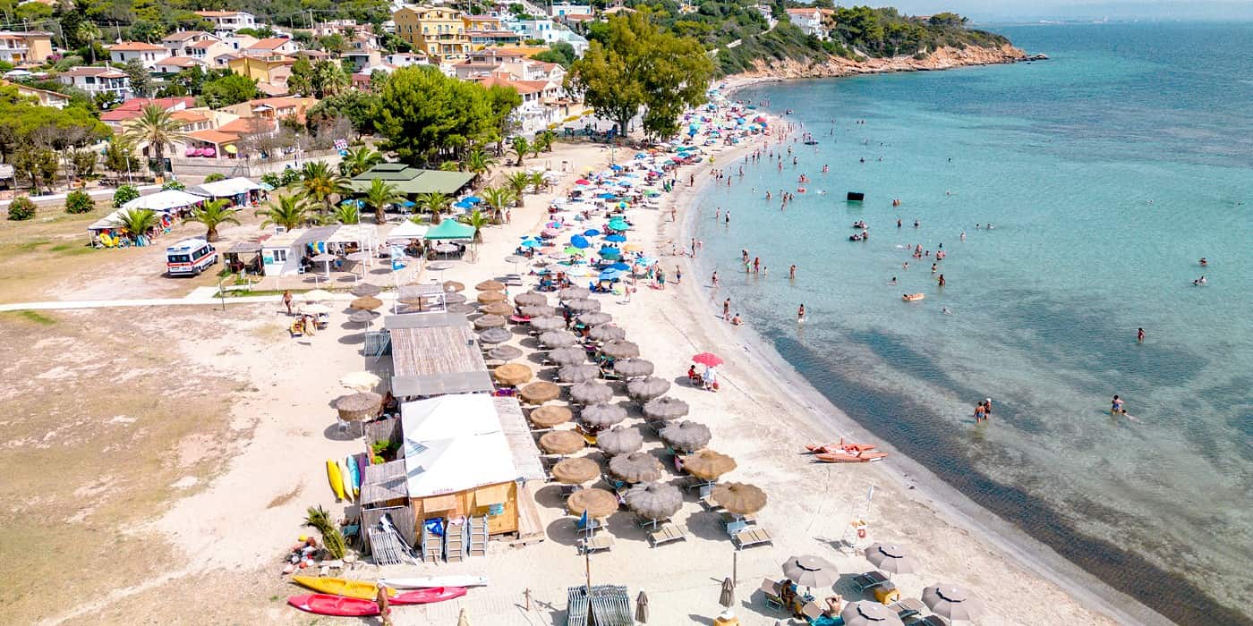 The sand here is thick and white, with volcanic streaks giving it a unique texture, and pockets of white sand appear along the shoreline. Waves are gentle, and the seabed stays shallow far out even when the mistral wind ruffles the surface. I followed the coastal path from Maladroxia, discovering hidden rock pools where locals collect sea urchins near an old archaeological site on the cliffs. At 1.5 km long, Coaquaddus is Sant’Antioco’s best beach for long walks, nature lovers, and anyone who wants to feel the island’s wild side on an island by a bridge formed by an artificial isthmus. Spring and autumn bring fewer crowds and sparkling water.