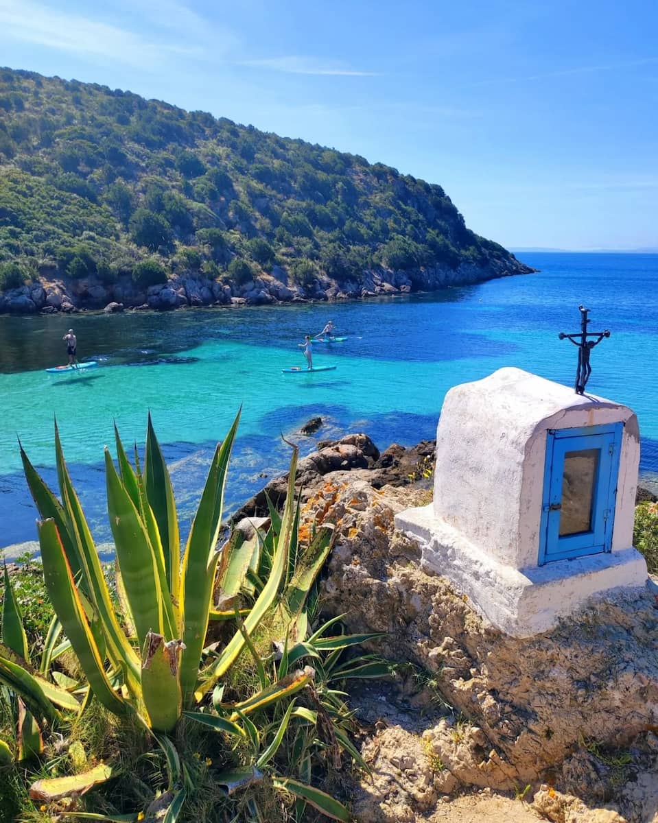 Pine trees lean toward a sheltered bay where the water is calm and clear. I shared the beach with only a few locals and a passing fisherman. The beach is about 60 meters, with soft sand—best from May to September.