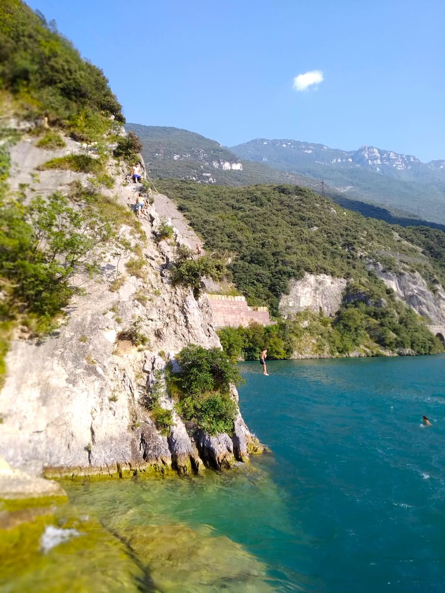 Access is by foot (follow signs from the hilltop trailhead) or by boat — the walk is part of the adventure as you move beside the shoreline. Locals treasure the hidden nocks along the cliffs for private sunbathing, a place to relax far from crowds. Bring everything you need, and visit midday when the sun warms the rocks and this part of the lake feels most inviting. The nearest parking is at the local Adventure Park, close to trails around Torbole for a half-day outing.