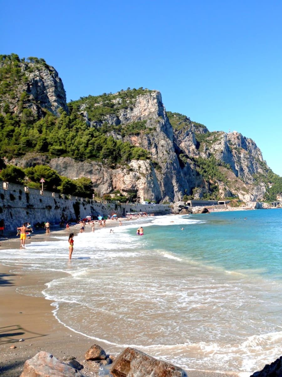 Capo Noli Beach lies east of Varigotti, with dramatic cliffs, deep blue water, and a rugged, adventurous feel that is perfect for those looking for raw coastal scenery. The cliffs drop straight into the sea here—a favorite spot for climbers and kayakers who enjoy the wild scenery along the line of Punta Crena and Capo Noli. The beach is small, about 70 meters, with mixed sand and pebbles, and is best from late June to mid-September when the sea is calm, offering a romantic and relaxing vibe for an evening stroll on la spiaggia.