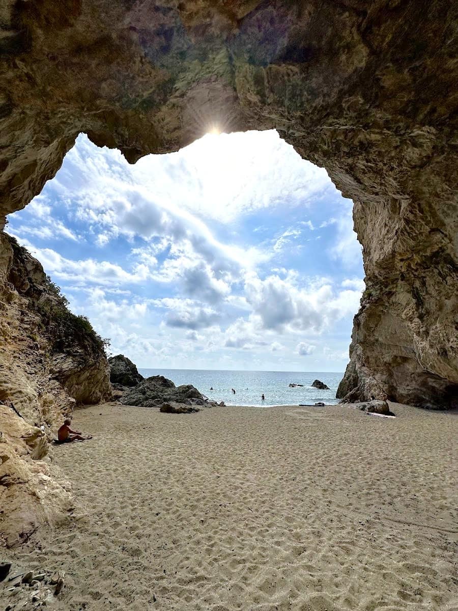 Grotta dell’Edera Beach is a secluded cove with dramatic rock formations and a magical vibe at sunset. The sound of waves lapping against the rocks and the scent of wild herbs fill the air—locals come here for peace and quiet, often bringing a bottle of wine to enjoy as the sun sets. The beach is tiny, just 40–50 meters, with golden sand and calm water—ideal in late spring and early autumn when the crowds are gone.